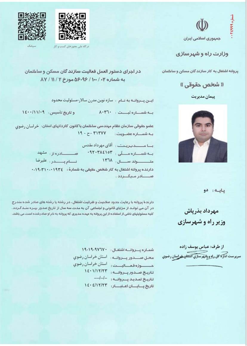 شرکت مجری ذیصلاح سازه نوین مدرن ، پایه 2 در مورخ 1401 تاسیس گردیده است .